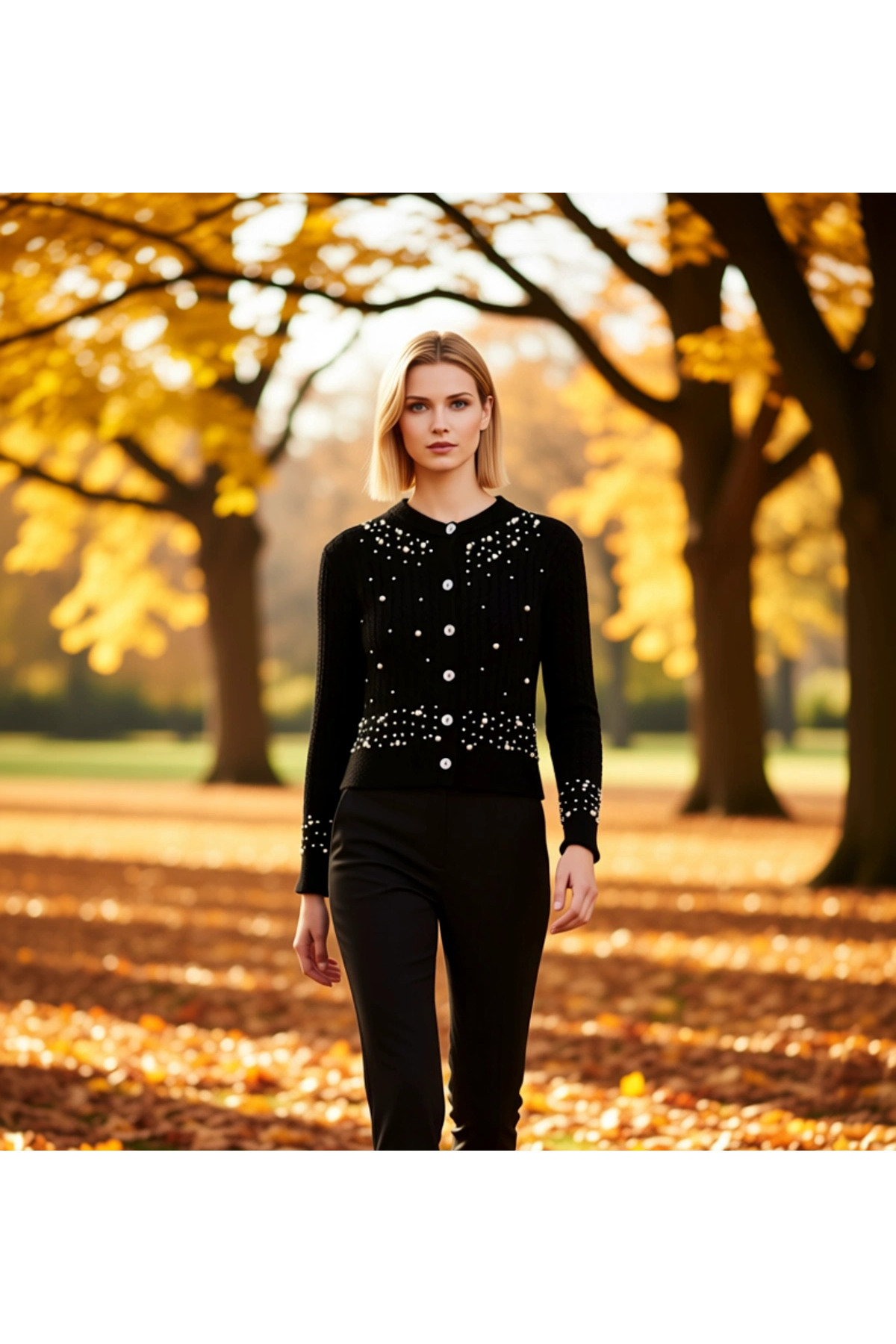 Kadın İncili Örgü Detaylı Crop Kesim Vücudu Saran Yumuşak Dokulu Şık Triko Hırka Ceket Spor
